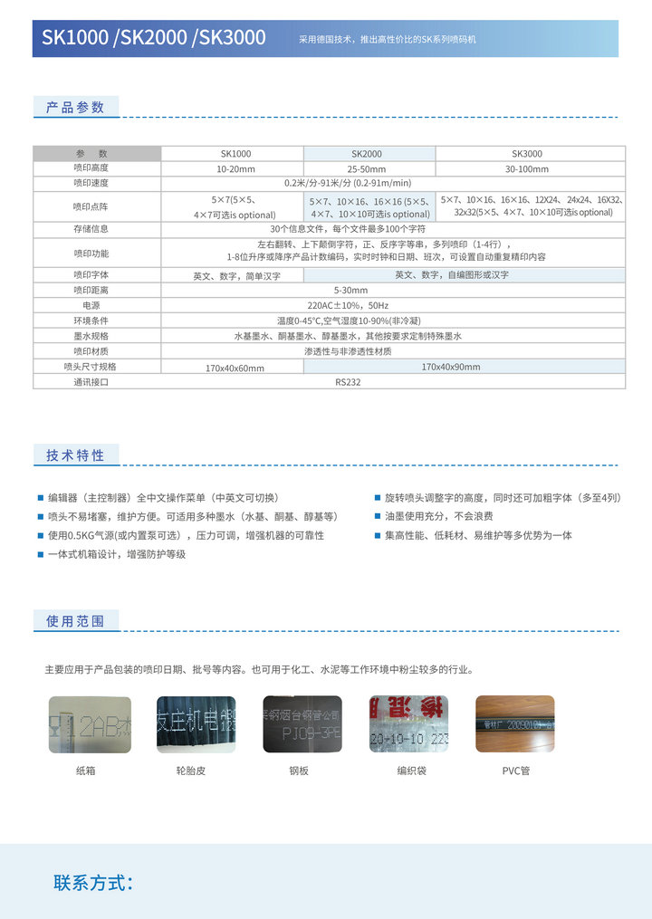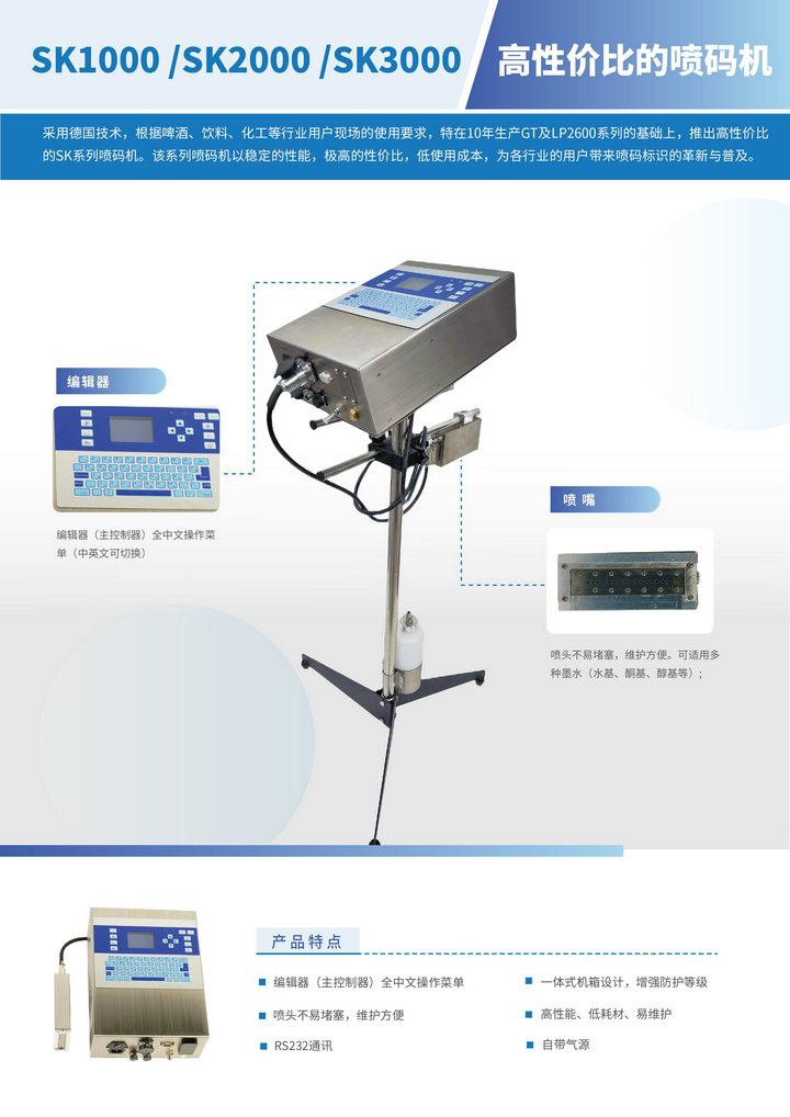 采用德国技术,根据啤酒、饮料、化工等行业用户现场的使用要求,特在10年生产GT及LP2600系列的基础上,推出高性价比的SK系列喷码机。该系列喷码机以稳定的性能,极高的性价比,低使用成本,为各行业的用户带来喷码标识的革新与普及。